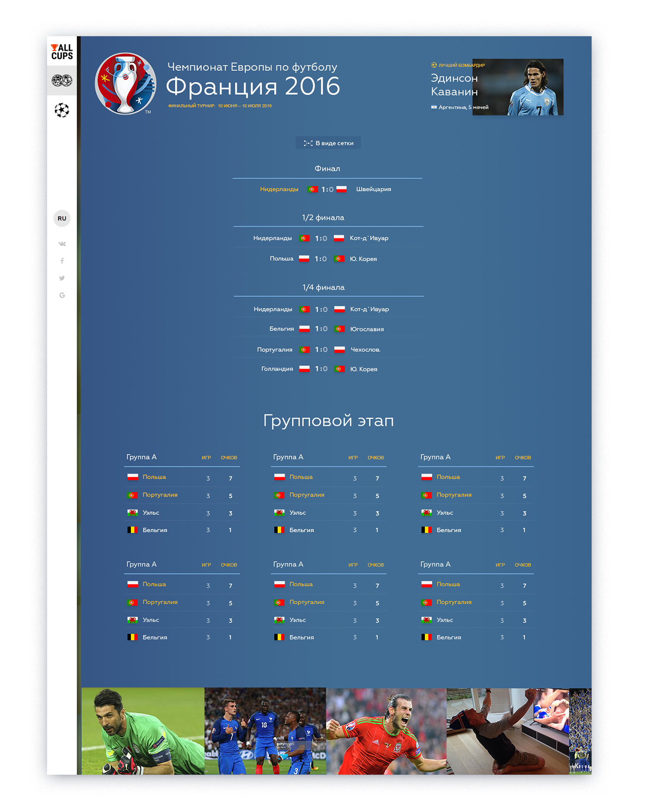 Информация о всех матчах чемпионатов мира и Европы по футболу на одном сайте.