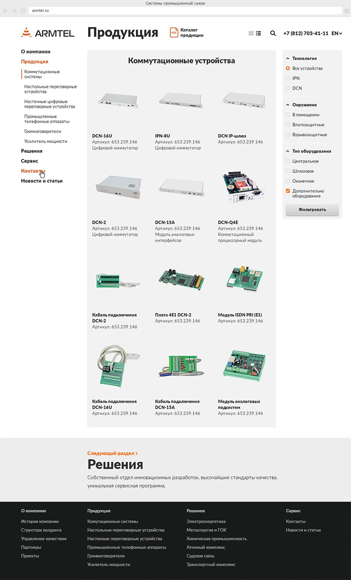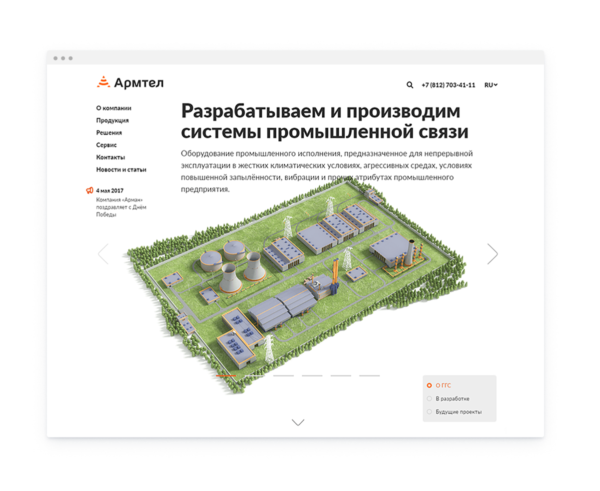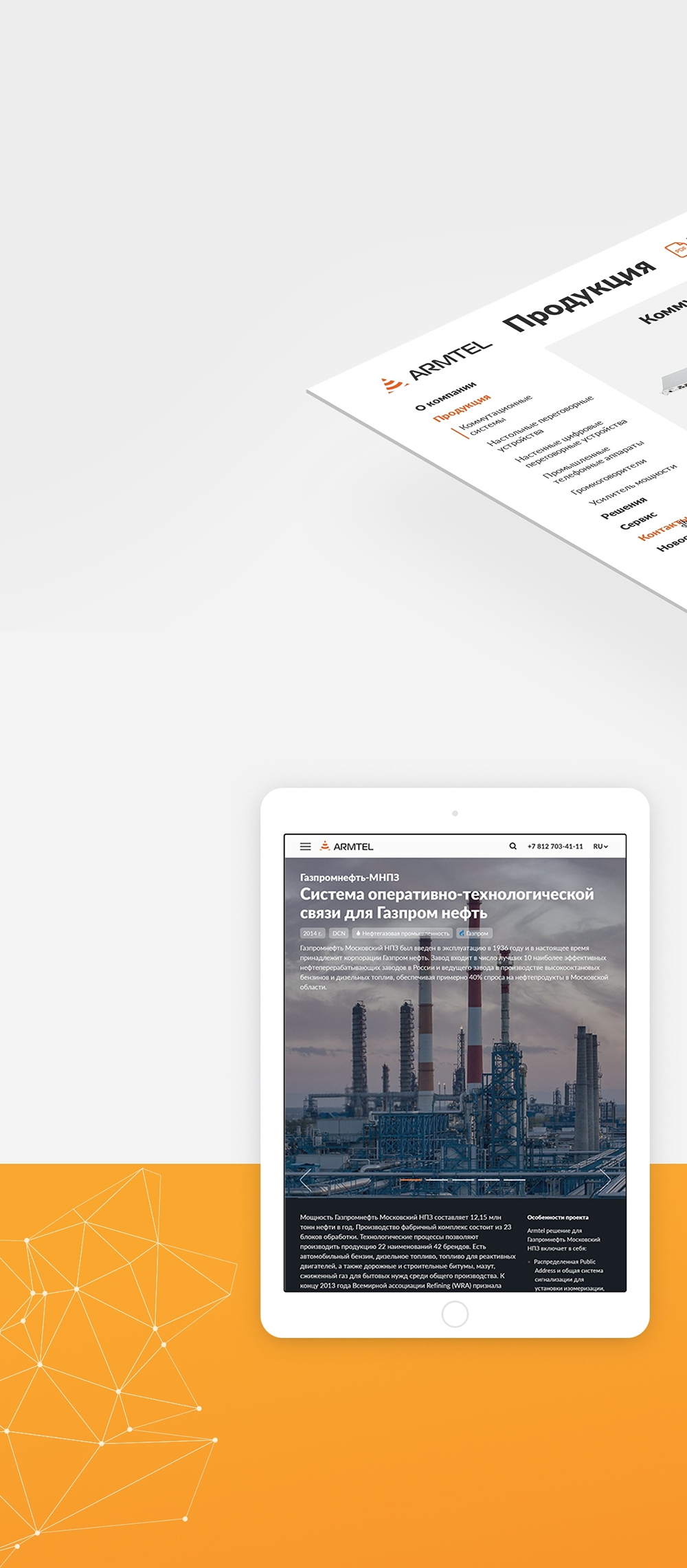 Для компании нужно было сделать редизайн сайта. Новый сайт должен был быть современным, удобным. Он должен был рассказать о миссии Армтела и представить полноценную информацию об оборудовании и возможных модификациях продукции.