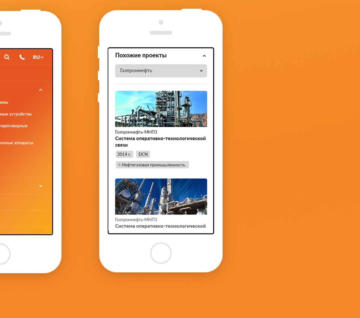 Следуя тому же принципу, создали раздел «Решения». Там разместили варианты использования оборудования, схемы подключения для разных отраслей промышленности и производств. Посетителю не нужно долго разбираться, какое оборудование ему искать, выбрав одно из решений, можно посмотреть, как оно применяется.