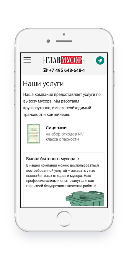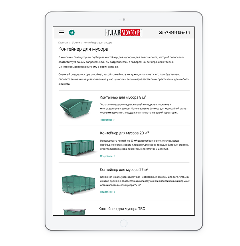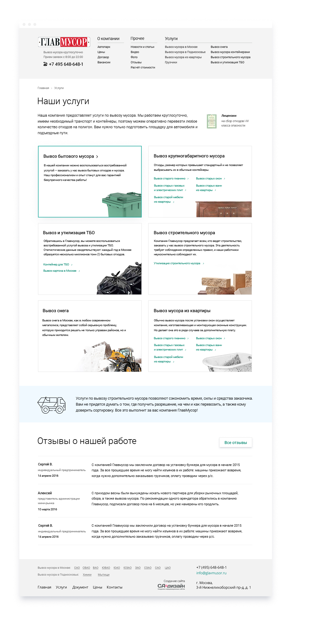 вывоза мусора и рассказывает о ценах и всех услугах компании.