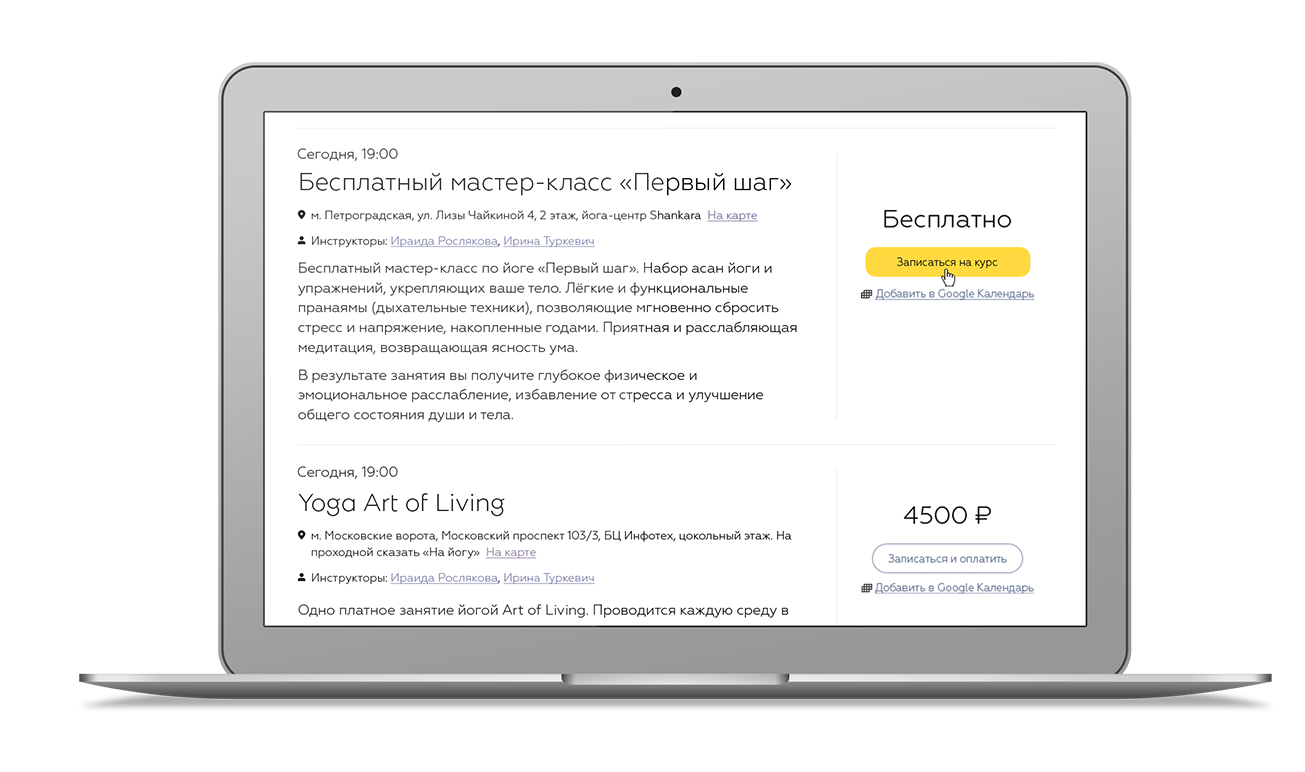 информацию об инструкторе, расписание его курсов, на которые можно записаться.