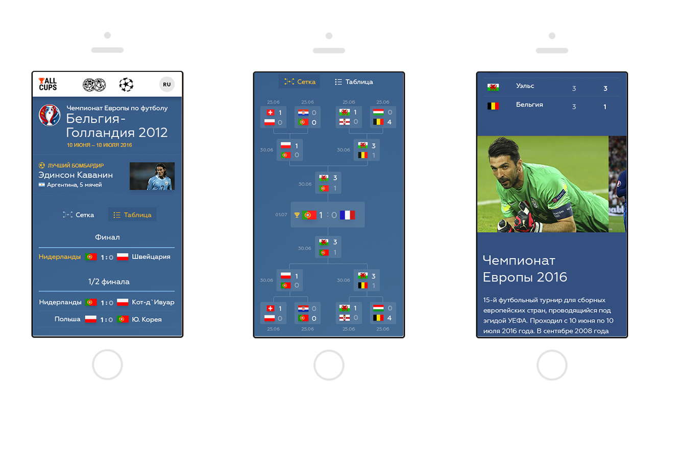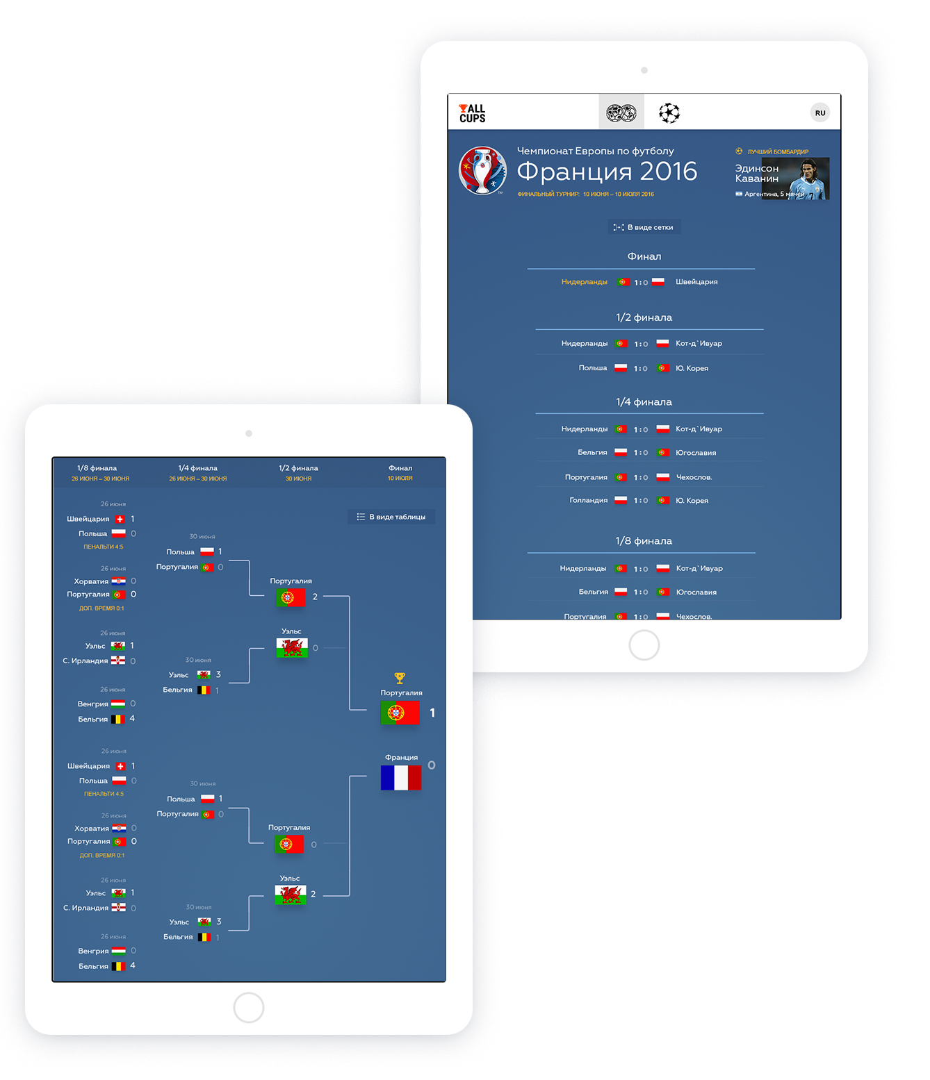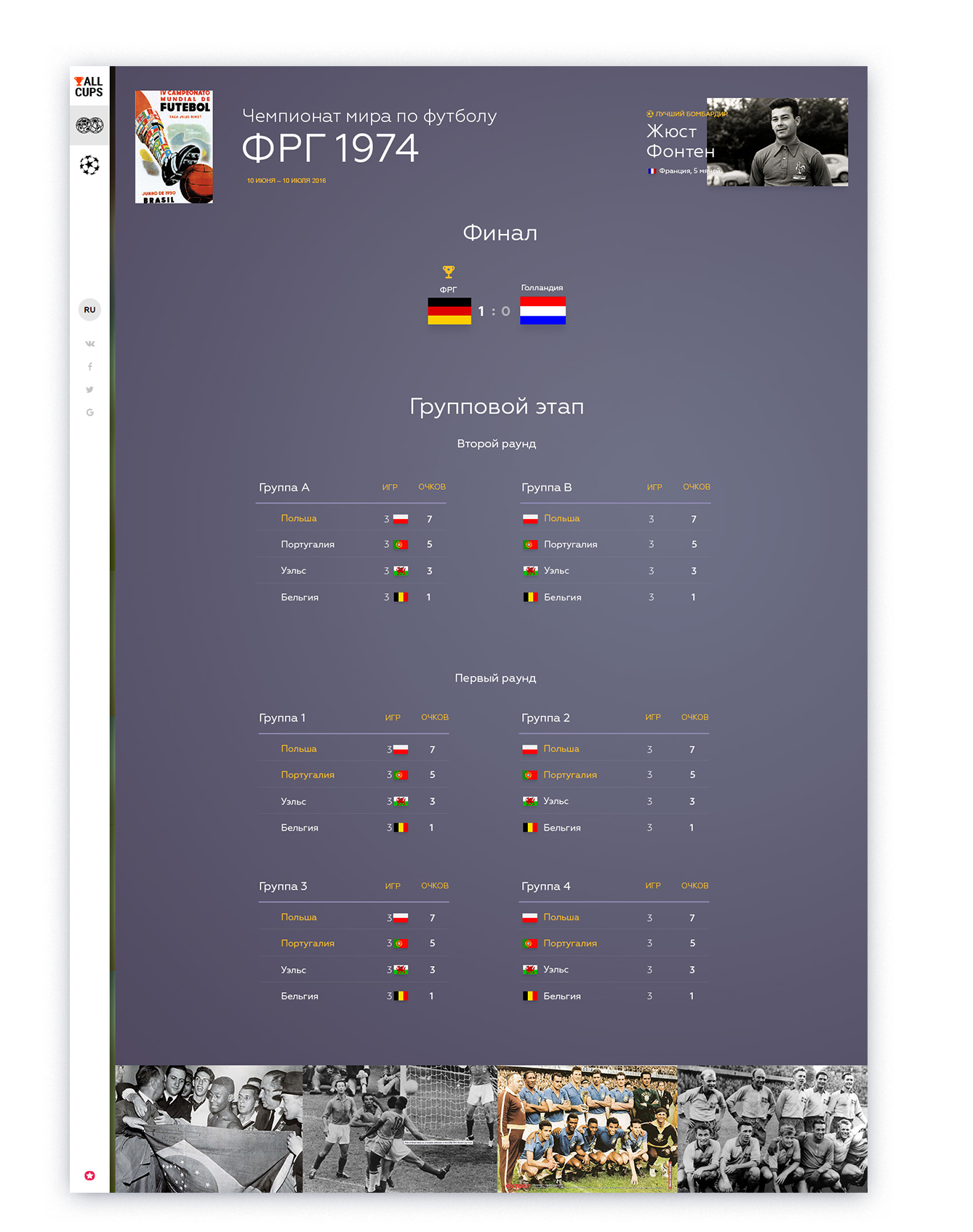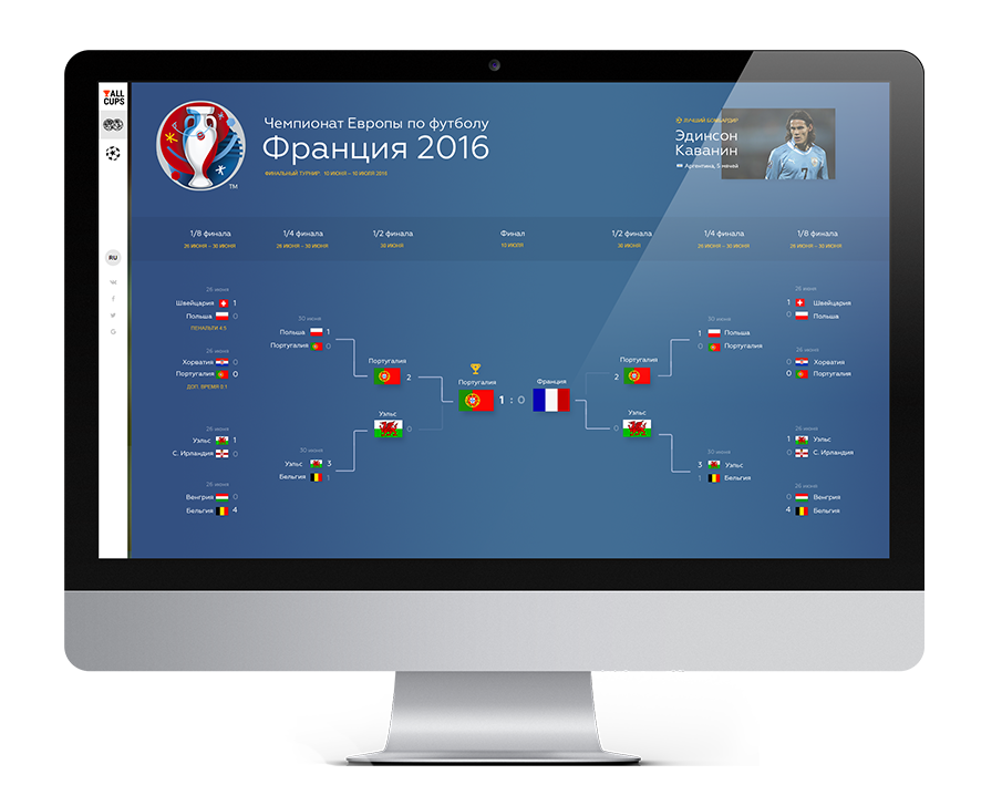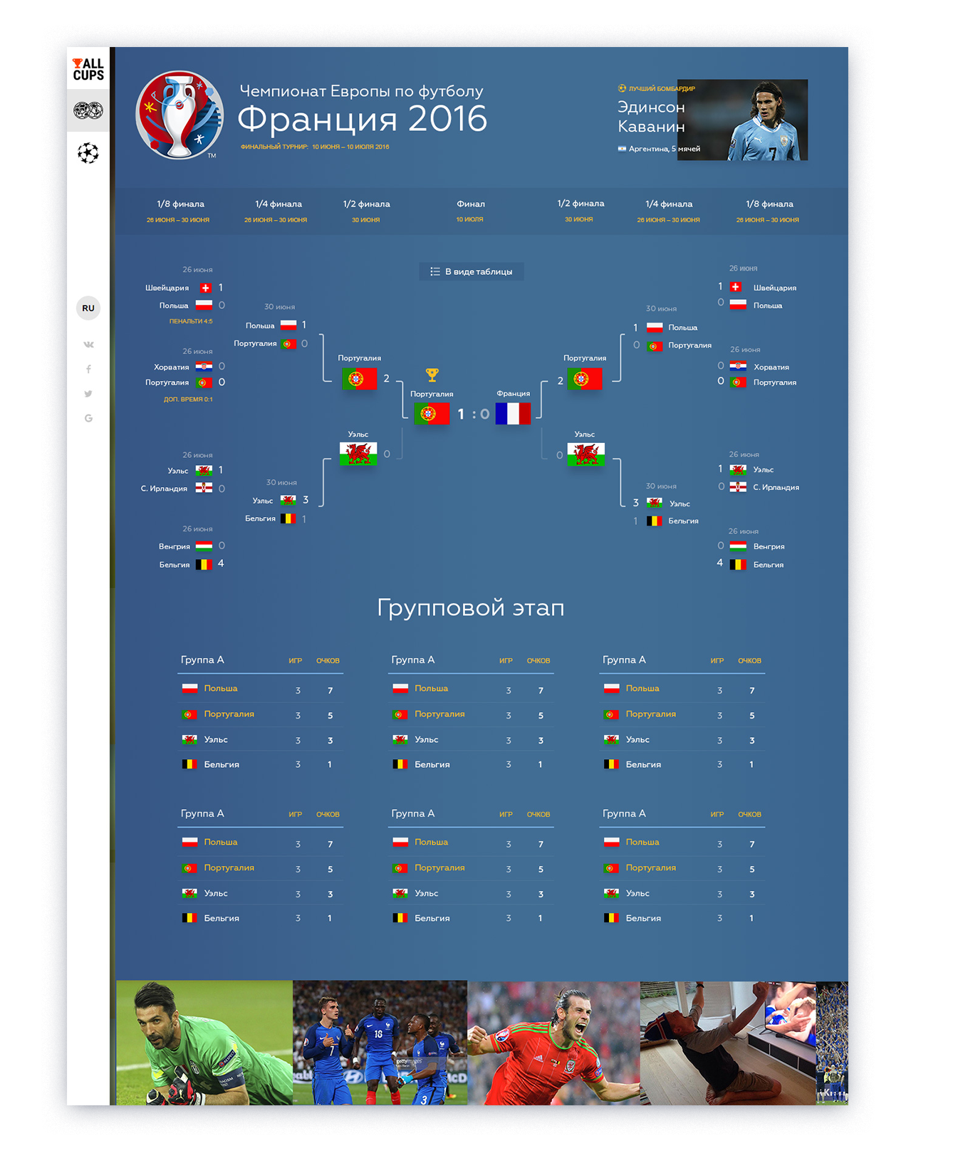 Информация о всех матчах чемпионатов мира и Европы по футболу на одном сайте.
