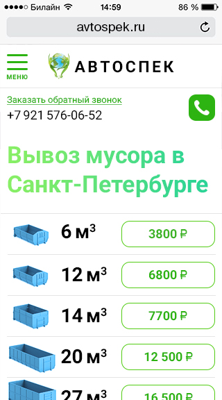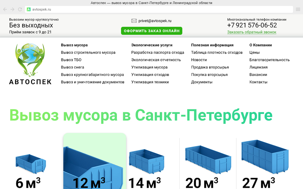 Автоспек занимается вывозом органического, строительного и технологического мусора. Компания работает по Санкт-Петербургу и Ленинградской области. Мы сделали сайт с удобной админ-панелью для добавления статей и управления тарифами.
