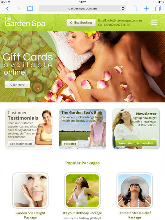 Garden Spa — салон красоты в Сиднее. Сайт салона не менялся почти 7 лет. На основе текущего дизайна мы адаптировали сайт под телефоны и планшеты. Теперь сайт хорошо выглядит на мобильных устройствах и лучше индексируется поисковиками.