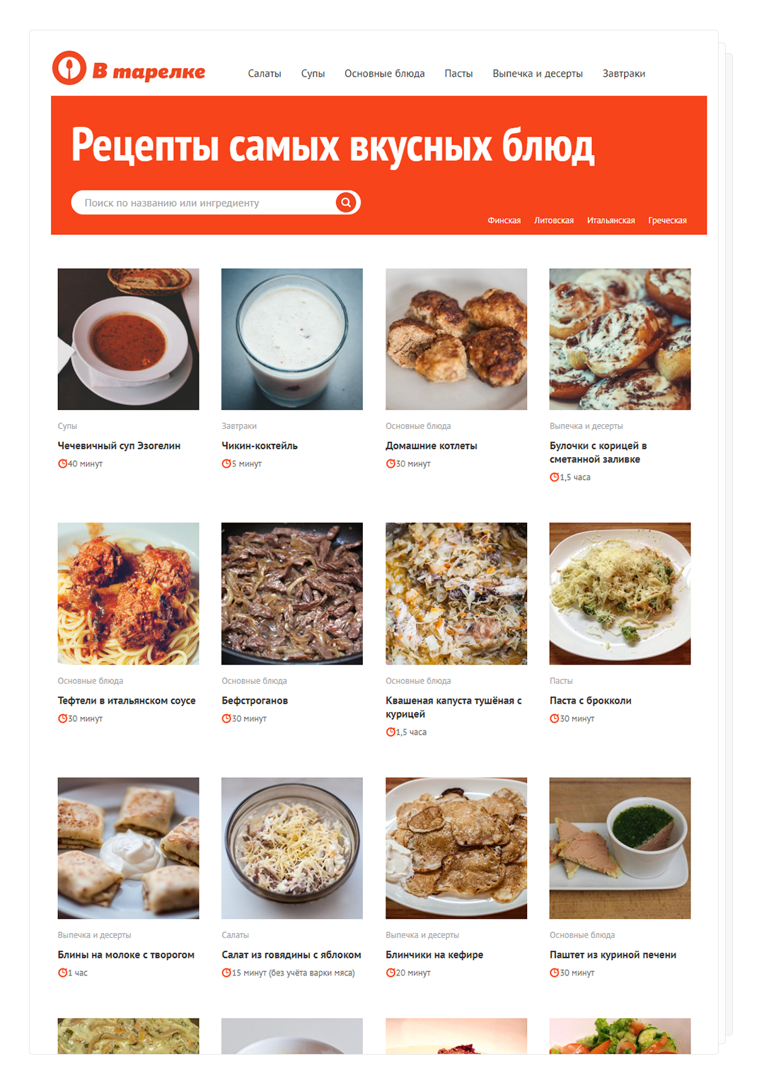 Главная страница отображает полный списк блюд.