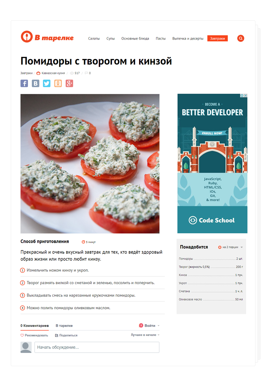 На странице рецепта список ингредиентов и